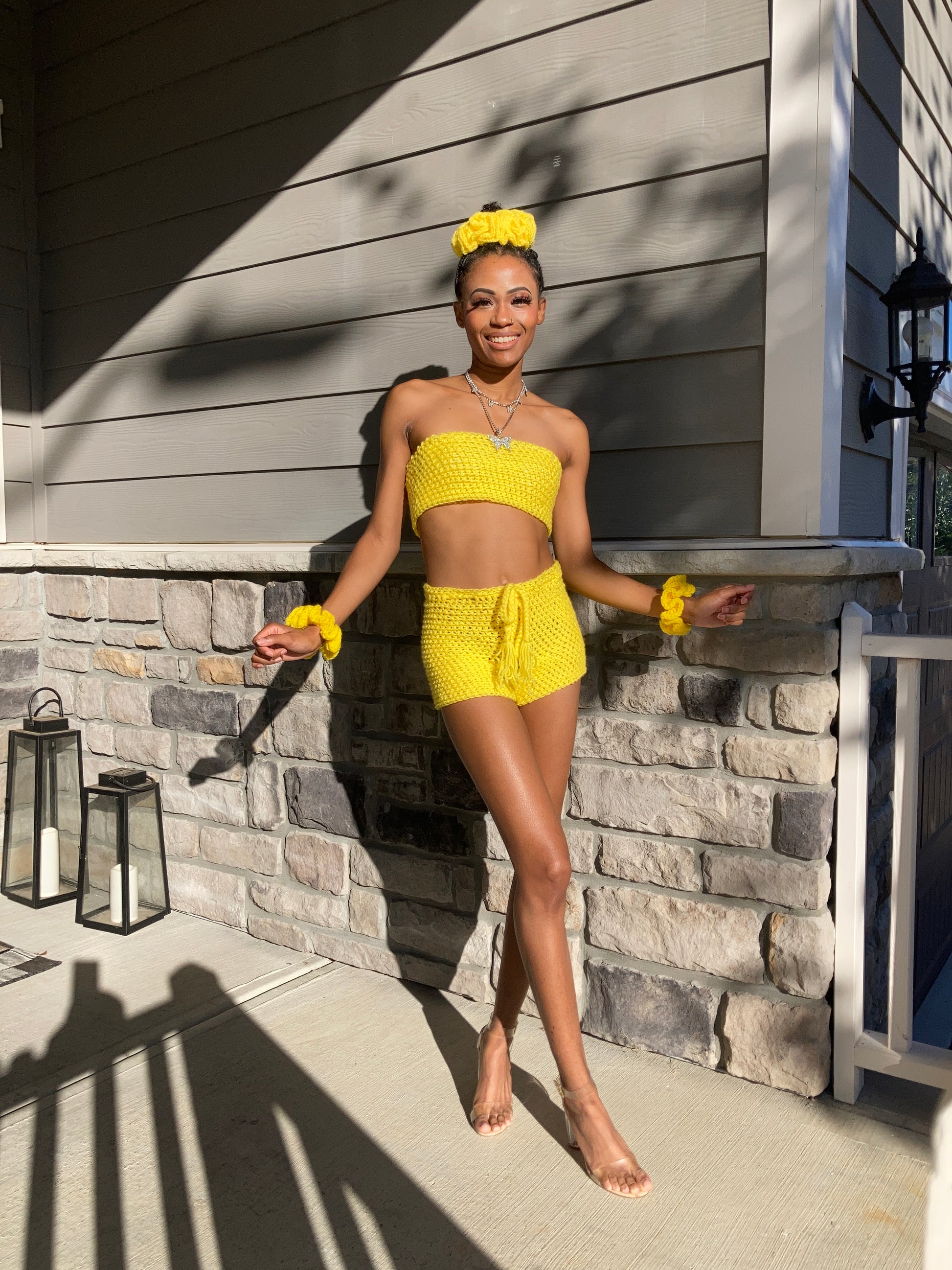 Elevate your summer style with this exquisite handmade crochet bandeau top and shorts set. The shorts feature a delightful braided drawstring for a touch of elegance. Effortlessly versatile and comfortable, this set is ideal for both casual outings and relaxing days by the water.